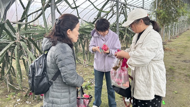 随后,教师们前往火龙果采摘园和紫海蓝山景区,亲身体验了田间劳作的乐趣。在采摘火龙果和萝卜的过程中,大家不仅享受到收获的喜悦,更深刻体会到了劳动人民辛勤耕耘的不易,以及劳动成果的珍贵。此项体验活动不仅让大家在自然中放松身心,也加深了对农业劳动的理解和尊重。