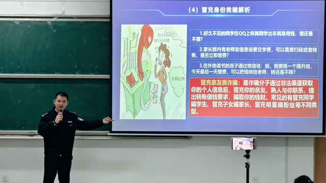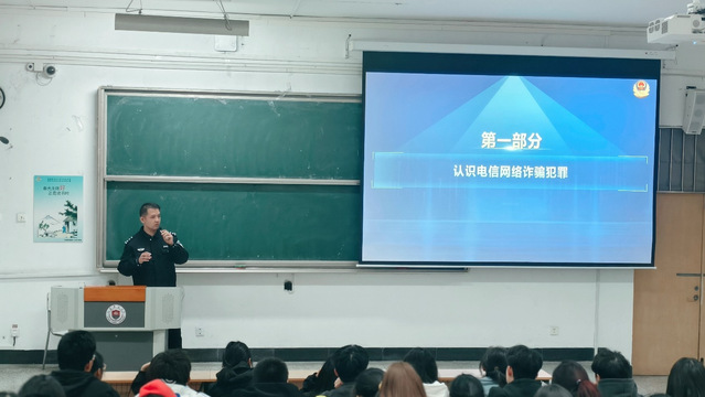 丁警官从什么是电信网络诈骗引入,对电信网络诈骗的概念、发展、形式以及发案特点进行讲解。结合近年来的典型案列,列举出网络游戏诈骗、冒充客服诈骗等常见的诈骗类型,深入浅出地向同学们讲解电信网络诈骗的常见手段、作案特点和防范措施。