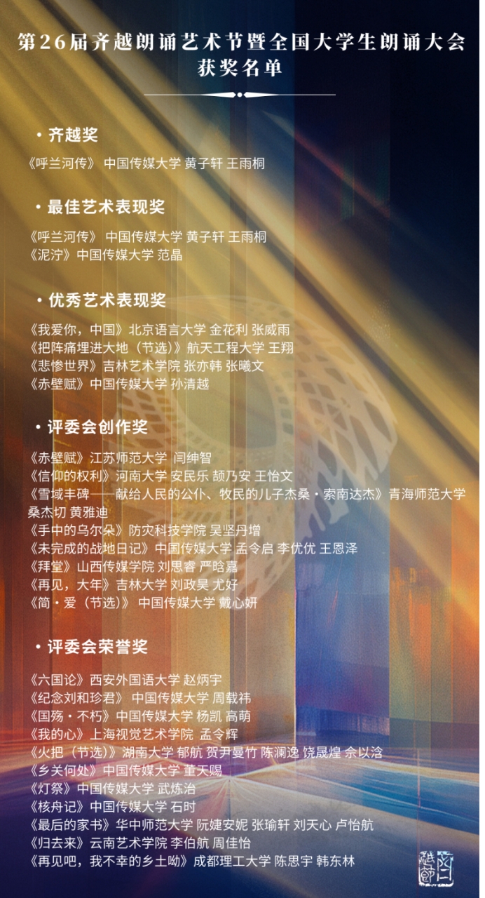 11月16日,由教育部语言文字应用管理司、教育部关心下一代工作委员会指导,国家语言文字推广基地(中国传媒大学)、中国高等院校影视学会主办,中国传媒大学播音主持艺术学院、中国高等院校影视学会播音主持专业委员会承办的第26届齐越朗诵艺术节暨全国大学生朗诵大会(以下简称大会)总决赛在北京落下帷幕。由江苏师范大学语言科学与艺术学院冯硕老师指导的2024级研究生闫绅智朗诵的《赤壁赋》荣获“评委会创作奖”。