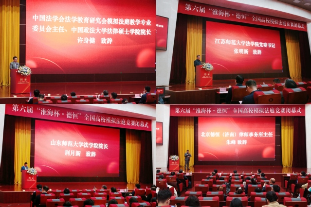 24日下午,第六届“淮海杯•德恒”全国高校模拟法庭竞赛闭幕式在山东师范大学长清湖校区树蕙堂报告厅举办。中国法学会法学教育研究会模拟法庭教学专业委员会主任、中国政法大学法律硕士学院院长许身健,山东师范大学党委常委、副校长郑元杰,山东省法学会副会长谢桂山,江苏师范大学法学院党委书记张明新,江苏师范大学法学院副院长张峰振,江苏师范大学法学院刑事教研室主任张杰,北京德恒(济南)律师事务所执行主任朱峰,山东师范大学教务处副处长崔文新,山东师范大学法学院院长荆月新出席闭幕式并致辞,活动由山东师范大学法学院党委书记王志强主持。闭幕式结束后举行了隆重的颁奖仪式。