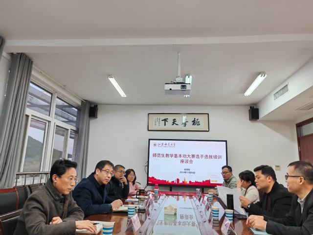 为全面总结长三角师范生教学基本功大赛及江苏省师范生教学基本功大赛的获奖经验与不足并启动2025年的师范生教学基本功大赛选手选拔工作,11月27日下午文学院召开了师范生教学基本功大赛选手选拔培训工作座谈会。院党委书记葛大伟、院长王立增、院长助理温德朝以及大赛指导教师团队成员王力、步进、霍生玉、周珩帮、李敏等老师出席,获奖选手刘德茹同学代表全体参赛选手参会。座谈会由教学副院长刘君敬主持。