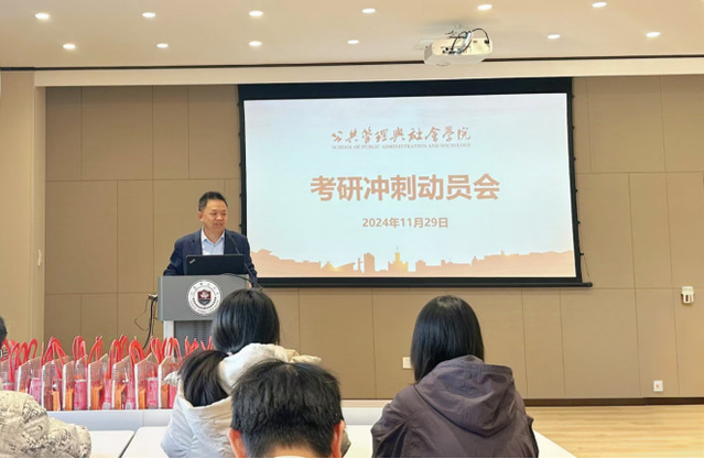 为激励考研学生在最后冲刺阶段保持昂扬斗志,助其缓解压力,坚定信心,11月29日下午,公共管理与社会学院召开考研冲刺动员会。院长祝天智、党委副书记徐作锋、团委书记陈妍、辅导员苗天添、2025届全体考研同学参加了活动。