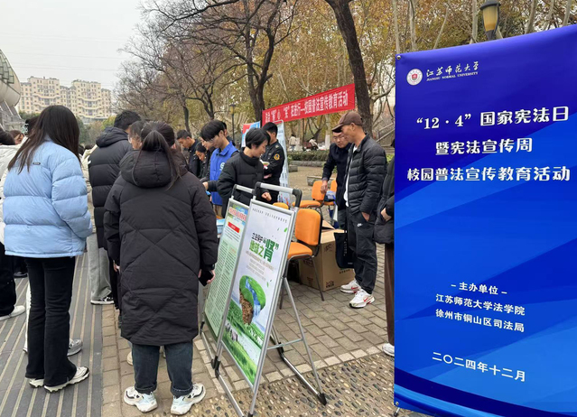 2024年12月4日下午,江苏师范大学法学院与铜山区司法局共同举办“国家宪法日”系列宣传教育活动。校党委常委、纪委书记闾浩和徐州市司法局党组书记、局长艾新平出席活动,铜山区委政法委副书记王成、铜山区司法局局长周提海、法学院院长菅从进等负责同志、校普法志愿者大队志愿者及师生代表参加活动。
