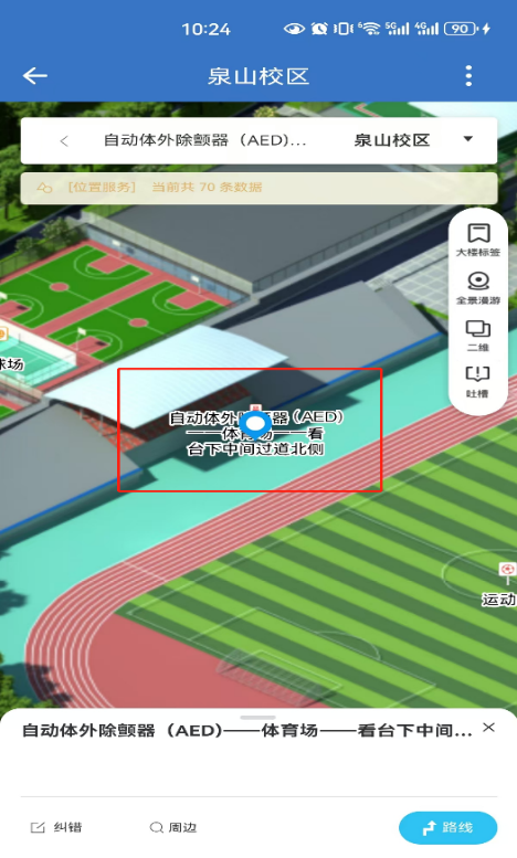 2.进入地图,根据本人所在的位置可获取到离自己当前定位最近的“AED”,选择点击导航后即可前往获取。