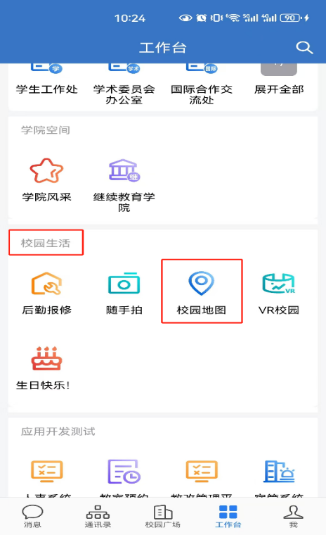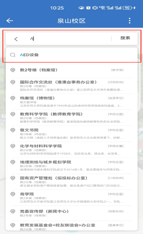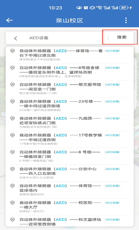 1.下载“爱师大”APP注册登录,在首页右下角切换到“工作台”,找到“校园生活”,点击“校园地图”进入,然后在搜索框搜索“AED设备”,点击“搜索”进入。搜索结果中即可看到校园内所有的AED设备。