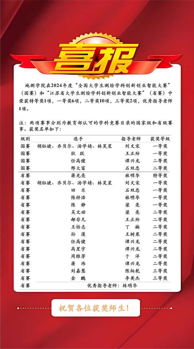 近日,备受瞩目的2024年度“全国大学生测绘学科创新创业智能大赛”测绘技能竞赛,以及第九届“江苏省大学生测绘学科创新创业智能大赛”圆满结束。这两项赛事分别由中国测绘学会教育工作委员会和江苏省测绘地理信息学会主办。