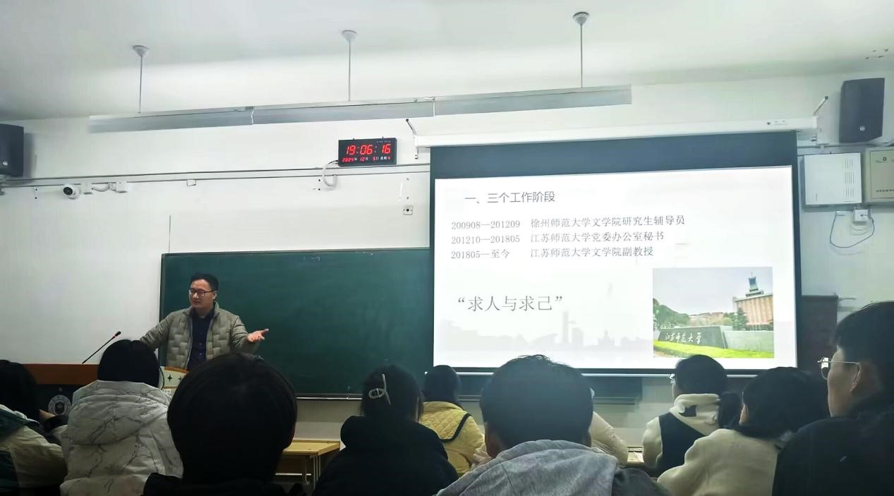 为切实增强秘书学专业学生的实践技能与综合素养,提升学生在未来职场中的核心竞争力,12月5日,文学院秘书学专业组织开展了“扶遥·成为优秀秘书”讲坛第三期讲座。江苏师范大学文学院温德朝副教授应邀作“秘书是如何炼成的”专题报告。讲座由秘书与写作教研室主任陈韬老师主持,教研室部分教师及大一、大二秘书学专业学生参加。温德朝老师以其丰富的“三个工作阶段”与“四次借调经历”为蓝本,深入总结出“六点工作体会”,并提出“五个殷切希望”。他以鲜活生动且通俗易懂的方式,为同学们悉心解读了迈向优秀秘书与卓越办公室工作者行列的关键密码与核心要诀。在讲座的最后,温老师提出,希望秘书学专业学生在今后的学习与工作中能够秉持上进之心、做到处处留心,善于合群、坚守正派、心怀感恩,在实践中积累经验,锤炼技能,成为出类拔萃的秘书人才。