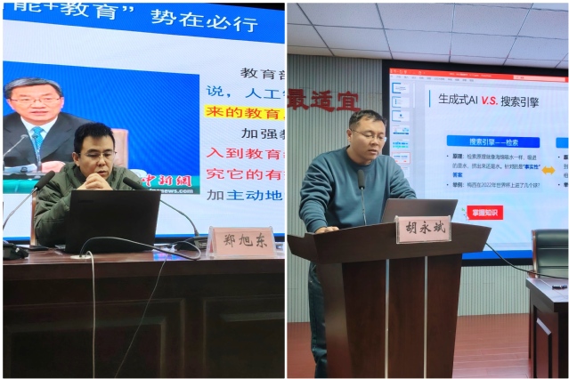 活动期间,学院郑旭东与胡永斌两位教师分别为沛县骨干教师带来了精彩的讲座报告。郑旭东以“智能时代的教师数字化发展创新”为主题,深入剖析了人工智能对中小学教育教学的深远影响,并系统阐述了智能时代教师所具备的关键能力与教师数字化发展的建议策略。他强调,在智能时代背景下,教师应不断提升自身的数字化素养,以适应教育变革的需求。胡永斌聚焦“AIGC赋能教学设计和教学资源生成”主题,为一线教师提供实用的技术指导和实践经验分享,他通过生动的案例讲解,帮助教师们掌握了高效完成教学设计、教案编写及教学资源制作的方法。两位教师的讲座不仅带来了前沿的教育理念与技术知识,更提供了宝贵的实践指导与启示。