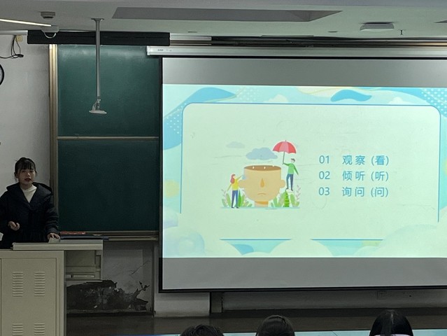 培训中,首先赵老师明确宿舍气象员角色定位,详细讲解该职位的工作职责和注意事项,引导大家日常要及时关注同学心理健康、积极协助学院做好学生与老师、学院之间的沟通桥梁。接着,赵老师通过案例分析帮助同学们明晰宿舍气象员的工作伦理以及助人技巧,希望同学们学会用耳听、用眼看、用口说、用心想,在倾听和理解同学的过程中,能够做到耐心和细心。最后赵老师深入浅出地阐述了心理危机的定义及其对个体和社会的潜在影响,强调了及时发现和干预危机的重要性。同时,她详细介绍了如何识别危机线索,在发现同学处于危机情况时,如何提供有效支持,使同学们能够更好地应对各种突发事件。