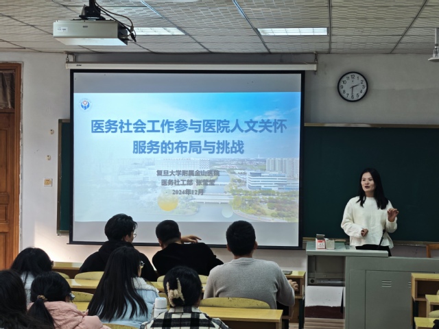 2015届校友、复旦大学附属金山医院医务社工部社会工作师张莹莹基于社会需求与个人工作体会,深入分享了医务社工的技术实务与心得。她着重强调了社会工作在医疗领域的重要作用,引导同学们进一步理解社会工作对于促进社会和谐与进步的重要意义。