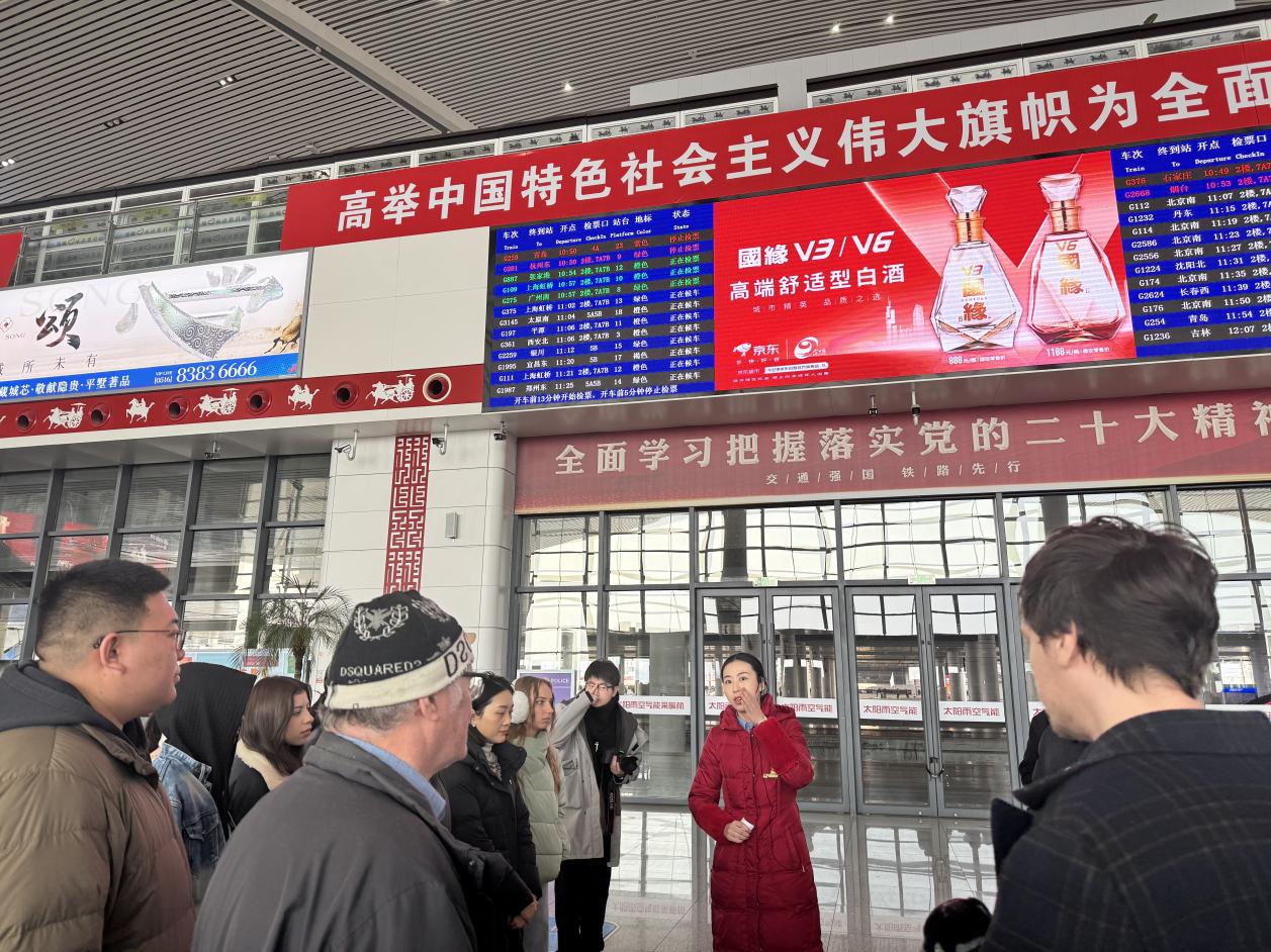 随后,师生们来到徐州东站。现代化铁路交通枢纽的高效与便捷令人瞩目,宏伟壮观的建筑外观、宽敞明亮且智能化的候车大厅,以及井然有序的进出站流程,让留学生们深入了解了中国高铁的发展成就与运营组织情况。工作人员介绍,中国高铁在速度、安全、准点率等方面均达到世界领先水平,中国高铁里程更是位居世界前列,并不断向全球输出先进技术与建设经验。留学生们听闻后惊叹不已,对“中国速度”背后的高科技支撑有了更为直观的认识,对中国铁路事业的卓越成就报以热烈掌声。