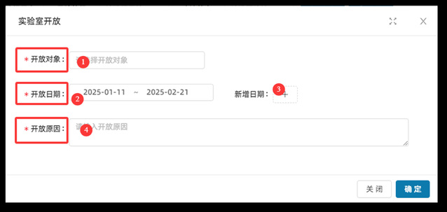 2.实验室安全信息系统于1月3日将所有实验室状态设为“关闭中”。需要开放的实验室,实验室安全责任人于1月4日—8日完成线上申请,选择实验室开放时间段。二级学院管理员1月9日前完成审核。获得开放批准的实验室状态调整为“开放中”。